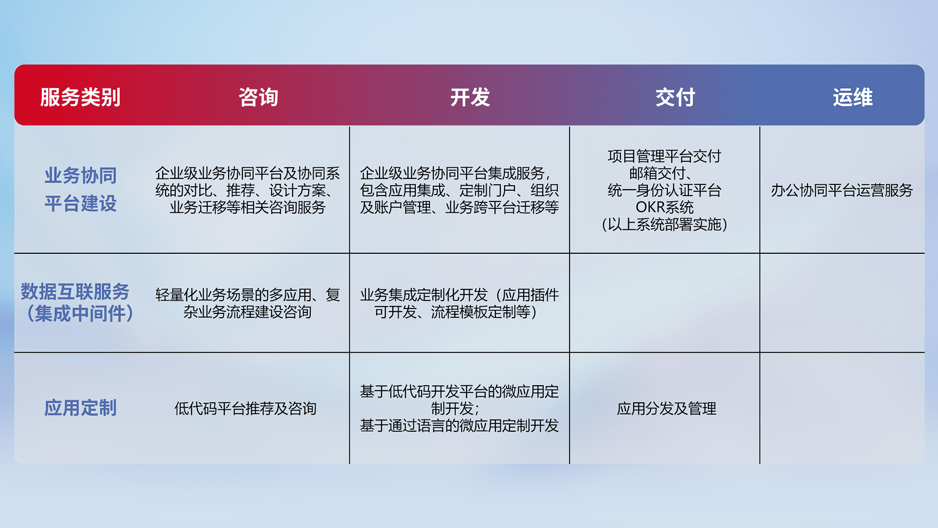 针对钉钉、、、、企微、、、、IDaas等平台级产品提供产品的规划、、方案、、、交付、、、、定制化开发等服务,,实现如统一协同办公、、、、智能客户服务、、、、混合会议管理、、、、智能数据查询、、、、等业务场景,,,实现数字化转型。。。