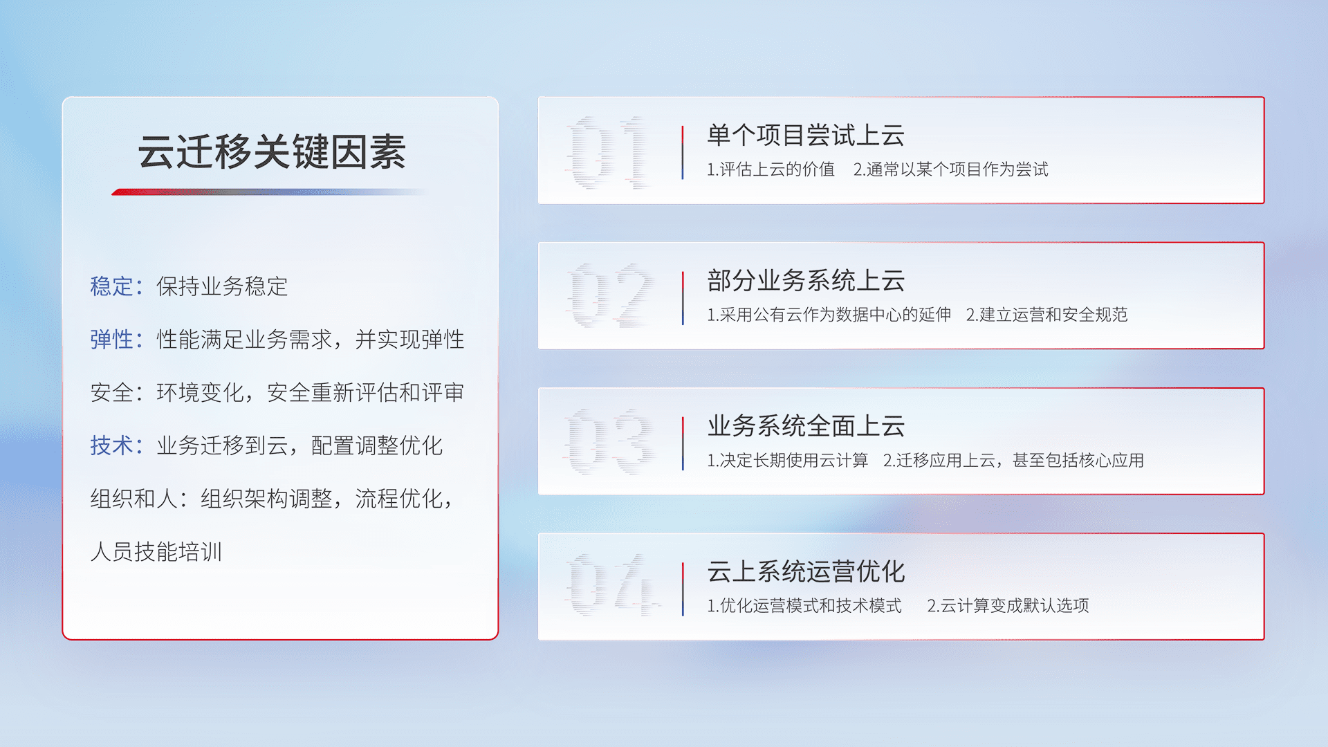结合实际业务,,从规划设计、、、云平台选型、、、、云原生改造、、、、数据迁移、、、、集成交付,,迁移全过程为客户识别最佳上云路径,,,做好风险识别管理,,设计网络架构、、、身份权限、、、、安全审计合规、、、操作审计、、、、日志审计、、、监控告警策略、、、多站点容灾设计等,,,,对云上基础设施进行整体规划,,,,提升IT治理水平,,以满足弹性、、、、高可用、、高性能的需求。。。。