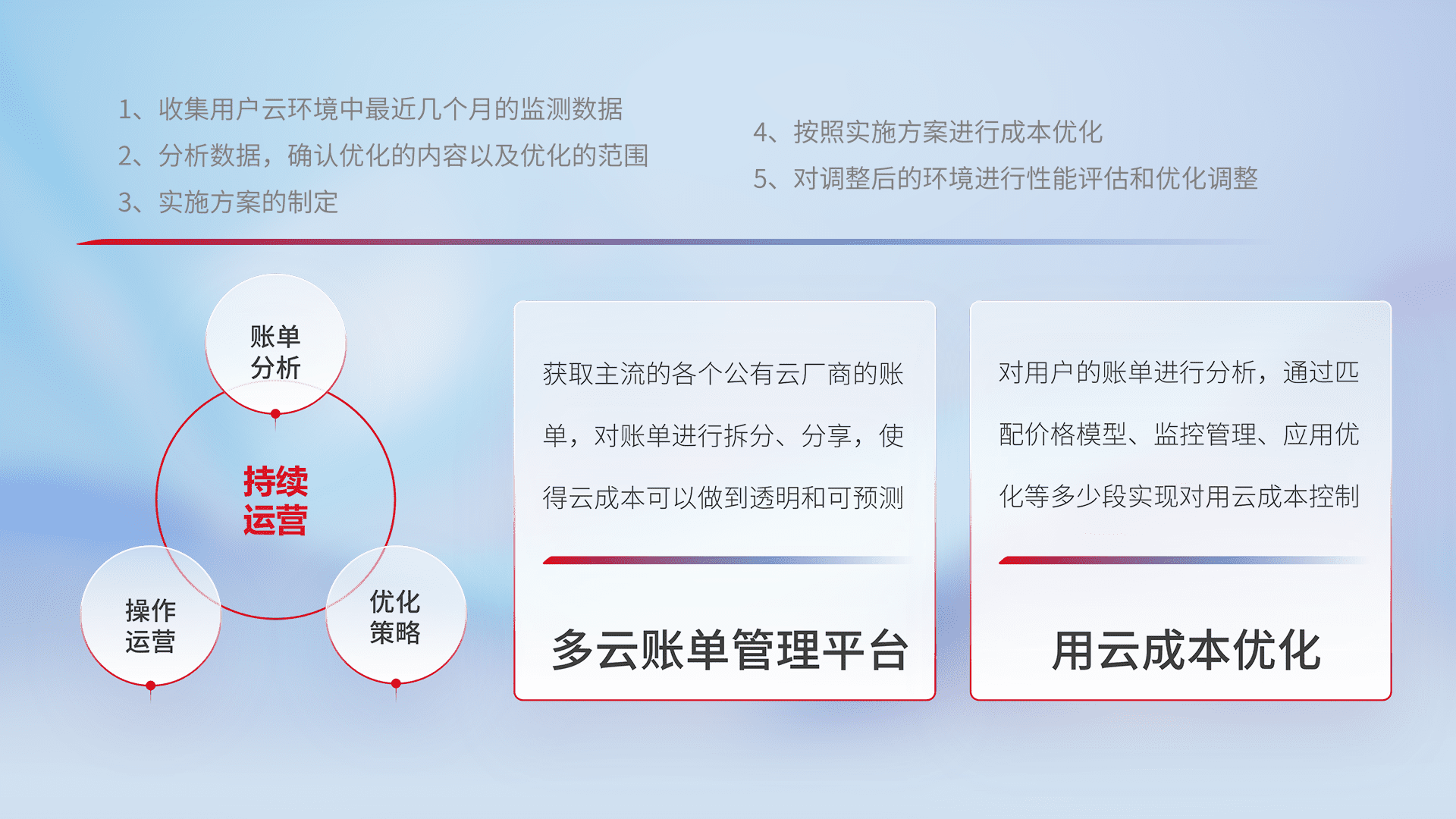 通过多云纳管,,,以统一的资源数据模型把客户的云资源进行抽象和封装,,,进而实现对多云资源的统一操作,,,,保障云资源管理的可靠性、、稳定性与可用性。。。量身定制化运维内容,,,配置、、开发运维、、补丁管理、、备份、、、监控、、、、认证和访问管理、、、、审计和日常巡检等,,,保障在用云过程中的可靠度,,,,稳定度以及高可用率。。